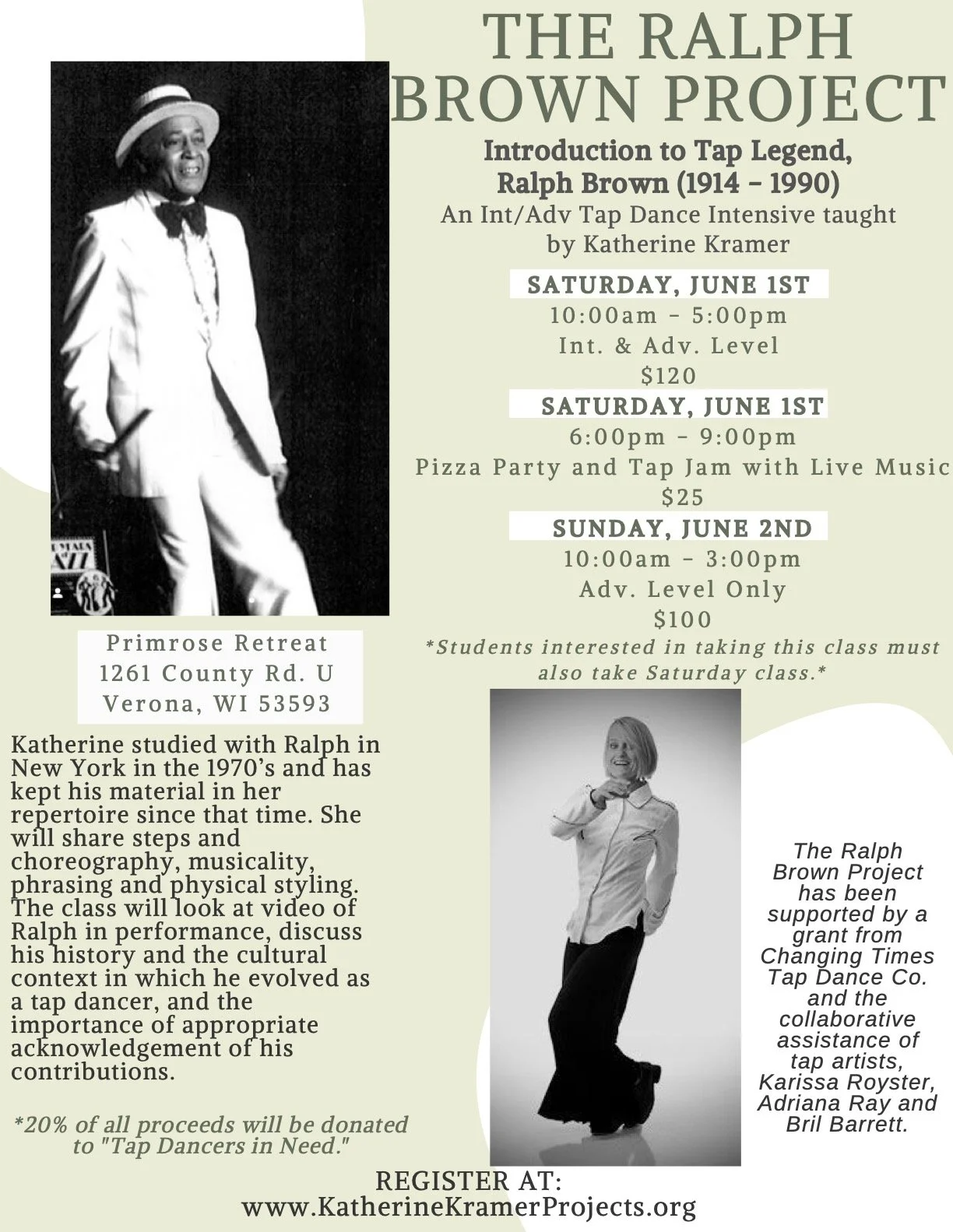 Katherine’s own history in tap goes back to NY in the 1970s, during which time she had the great pleasure of studying for 2 years with Ralph Brown. She first heard Ralph, in his hot pink tap shoes, at an event organized by Jane Goldberg at the Village Vanguard in 1978. After moving to NY in 1931 and becoming a regular at the Hoofer’s Club, Ralph went on to working at the Cotton Club, where he performed and toured with Cab Calloway for many years. He performed as well with Charlie Parker, and Duke Ellington, among others, and was a member of “The Original Hoofers.” Ralph performed in films, and on Broadway in “Black and Blue.” His enthusiasm for tap was infectious!